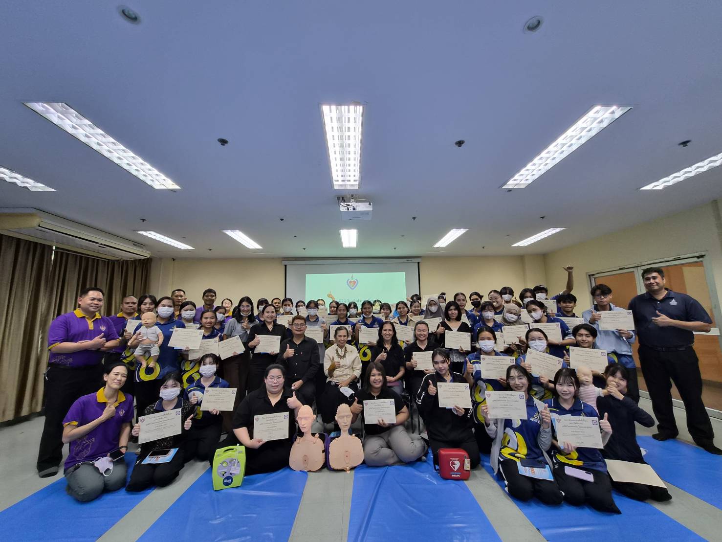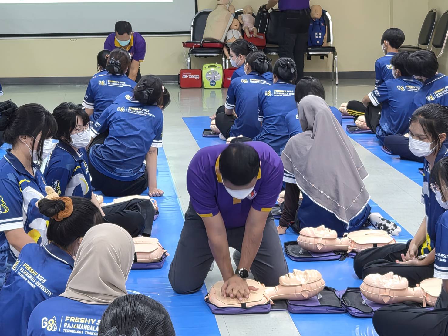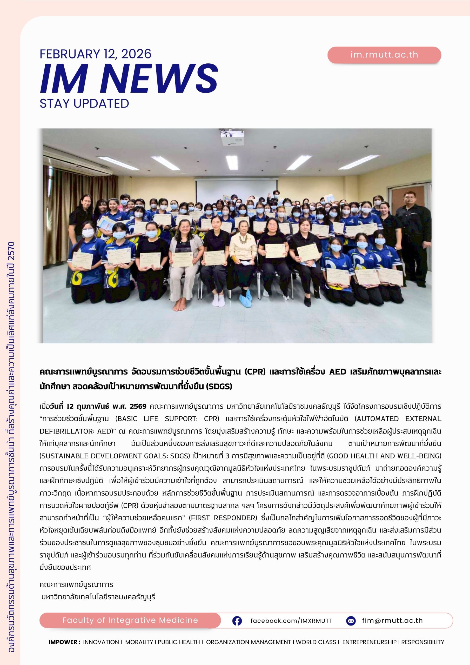 เมื่อวันที่ 12 กุมภาพันธ์ พ.ศ. 2569 คณะการแพทย์บูรณาการ มหาวิทยาลัยเทคโนโลยีราชมงคลธัญบุรี ได้จัดโครงการอบรมเชิงปฏิบัติการ “การช่วยชีวิตขั้นพื้นฐาน (Basic Life Support: CPR) และการใช้เครื่องกระตุ้นหัวใจไฟฟ้าอัตโนมัติ (Automated External Defibrillator: AED)” ณ คณะการแพทย์บูรณาการ โดยมุ่งเสริมสร้างความรู้ ทักษะ และความพร้อมในการช่วยเหลือผู้ประสบเหตุฉุกเฉินให้แก่บุคลากรและนักศึกษา อันเป็นส่วนหนึ่งของการส่งเสริมสุขภาวะที่ดีและความปลอดภัยในสังคม ตามเป้าหมายการพัฒนาที่ยั่งยืน (Sustainable Development Goals: SDGs) เป้าหมายที่ 3 การมีสุขภาพและความเป็นอยู่ที่ดี (Good Health and Well-being) การอบรมในครั้งนี้ได้รับความอนุเคราะห์วิทยากรผู้ทรงคุณวุฒิจากมูลนิธิหัวใจแห่งประเทศไทย ในพระบรมราชูปถัมภ์ มาถ่ายทอดองค์ความรู้และฝึกทักษะเชิงปฏิบัติ เพื่อให้ผู้เข้าร่วมมีความเข้าใจที่ถูกต้อง สามารถประเมินสถานการณ์ และให้ความช่วยเหลือได้อย่างมีประสิทธิภาพในภาวะวิกฤต เนื้อหาการอบรมประกอบด้วย หลักการช่วยชีวิตขั้นพื้นฐาน การประเมินสถานการณ์ และการตรวจอาการเบื้องต้น การฝึกปฏิบัติการนวดหัวใจผายปอดกู้ชีพ (CPR) ด้วยหุ่นจำลองตามมาตรฐานสากล ฯลฯ โครงการดังกล่าวมีวัตถุประสงค์เพื่อพัฒนาศักยภาพผู้เข้าร่วมให้สามารถทำหน้าที่เป็น “ผู้ให้ความช่วยเหลือคนแรก” (First Responder) ซึ่งเป็นกลไกสำคัญในการเพิ่มโอกาสการรอดชีวิตของผู้ที่มีภาวะหัวใจหยุดเต้นเฉียบพลันก่อนถึงมือแพทย์ อีกทั้งยังช่วยสร้างสังคมแห่งความปลอดภัย ลดความสูญเสียจากเหตุฉุกเฉิน และส่งเสริมการมีส่วนร่วมของประชาชนในการดูแลสุขภาพของชุมชนอย่างยั่งยืน คณะการแพทย์บูรณาการขอขอบพระคุณมูลนิธิหัวใจแห่งประเทศไทย ในพระบรมราชูปถัมภ์ และผู้เข้าร่วมอบรมทุกท่าน ที่ร่วมกันขับเคลื่อนสังคมแห่งการเรียนรู้ด้านสุขภาพ เสริมสร้างคุณภาพชีวิต และสนับสนุนการพัฒนาที่ยั่งยืนของประเทศ