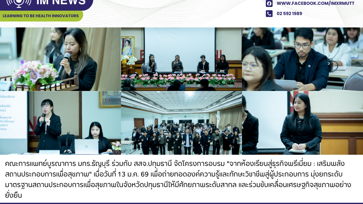 เมื่อวันที่ 13 มกราคม 2569 คณะการแพทย์บูรณาการ มหาวิทยาลัยเทคโนโลยีราชมงคลธัญบุรี (มทร.ธัญบุรี) นำโดยคณาจารย์และบุคลากรผู้เชี่ยวชาญ เข้าร่วมโครงการอบรมเชิงปฏิบัติการ "จากห้องเรียนสู่ธุรกิจพรีเมี่ยม : เสริมพลังสถานประกอบการเพื่อสุขภาพ" ณ จังหวัดปทุมธานี ซึ่งจัดขึ้นโดยสำนักงานสาธารณสุขจังหวัดปทุมธานี