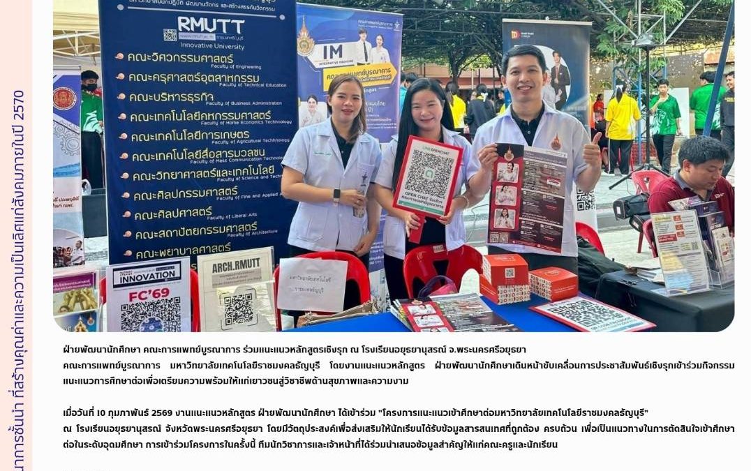 เมื่อวันที่ 10 กุมภาพันธ์ 2569 งานแนะแนวหลักสูตร ฝ่ายพัฒนานักศึกษา ได้เข้าร่วม "โครงการแนะแนวเข้าศึกษาต่อมหาวิทยาลัยเทคโนโลยีราชมงคลธัญบุรี" ณ โรงเรียนอยุธยานุสรณ์ จังหวัดพระนครศรีอยุธยา