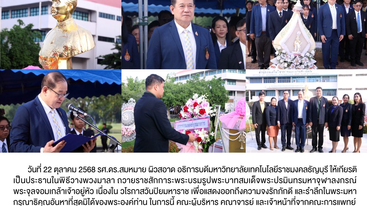 วันที่ 22 ตุลาคม 2568 รศ.ดร.สมหมาย ผิวสอาด อธิการบดีมหาวิทยาลัยเทคโนโลยีราชมงคลธัญบุรี ให้เกียรติเป็นประธานในพิธีวางพวงมาลา ถวายราชสักการะพระบรมรูปพระบาทสมเด็จพระปรมินทรมหาจุฬาลงกรณ์ พระจุลจอมเกล้าเจ้าอยู่หัว เนื่องใน วโรกาสวันปิยมหาราช เพื่อแสดงออกถึงความจงรักภักดี และรำลึกในพระมหากรุณาธิคุณอันหาที่สุดมิได้ของพระองค์ท่าน