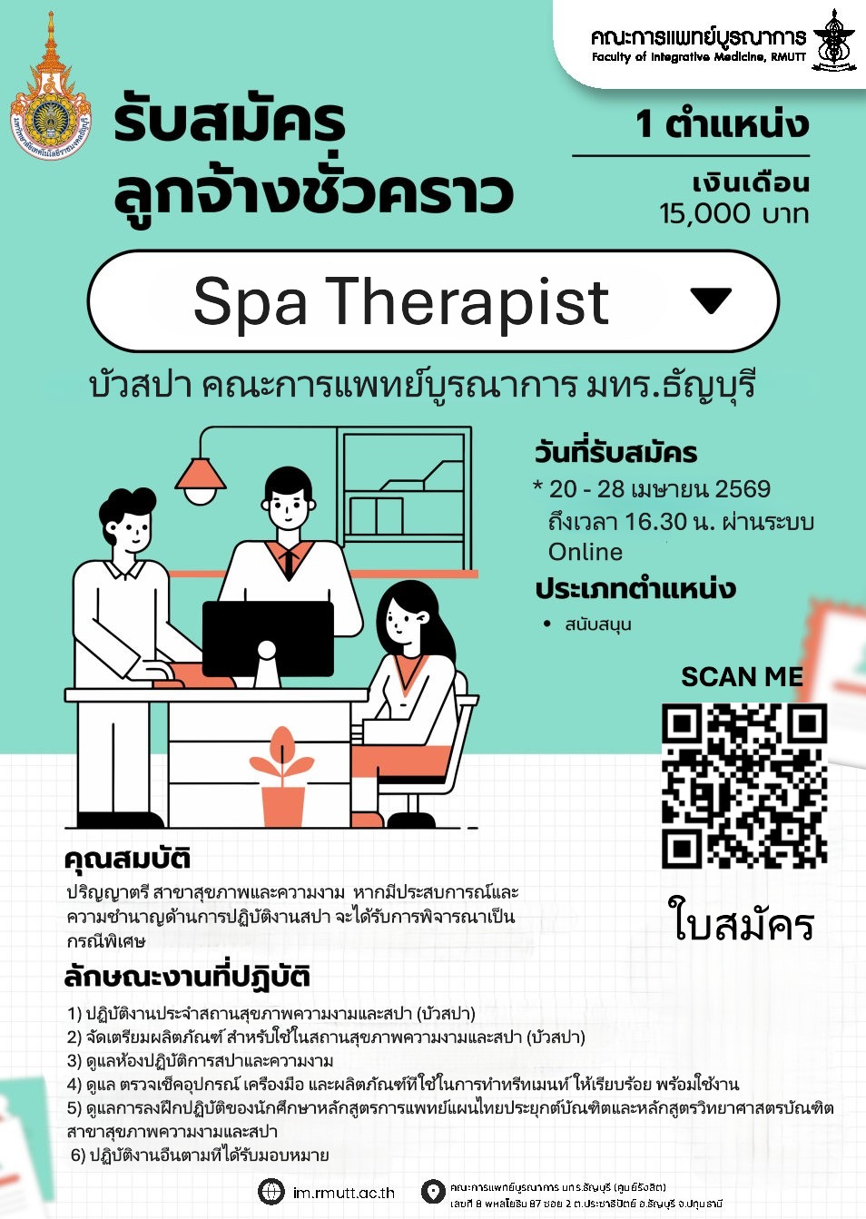 หากมีประสบการณ์และความชำนาญด้านปฏิบัติงานสปา จะได้รับการพิจารณาเป็นกรณีพิเศษ