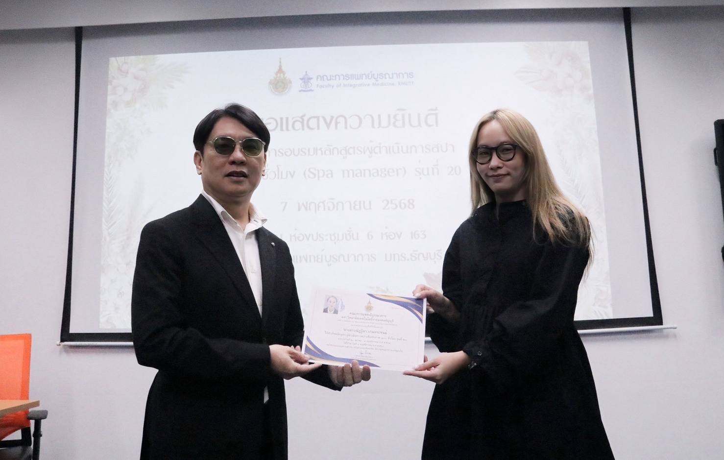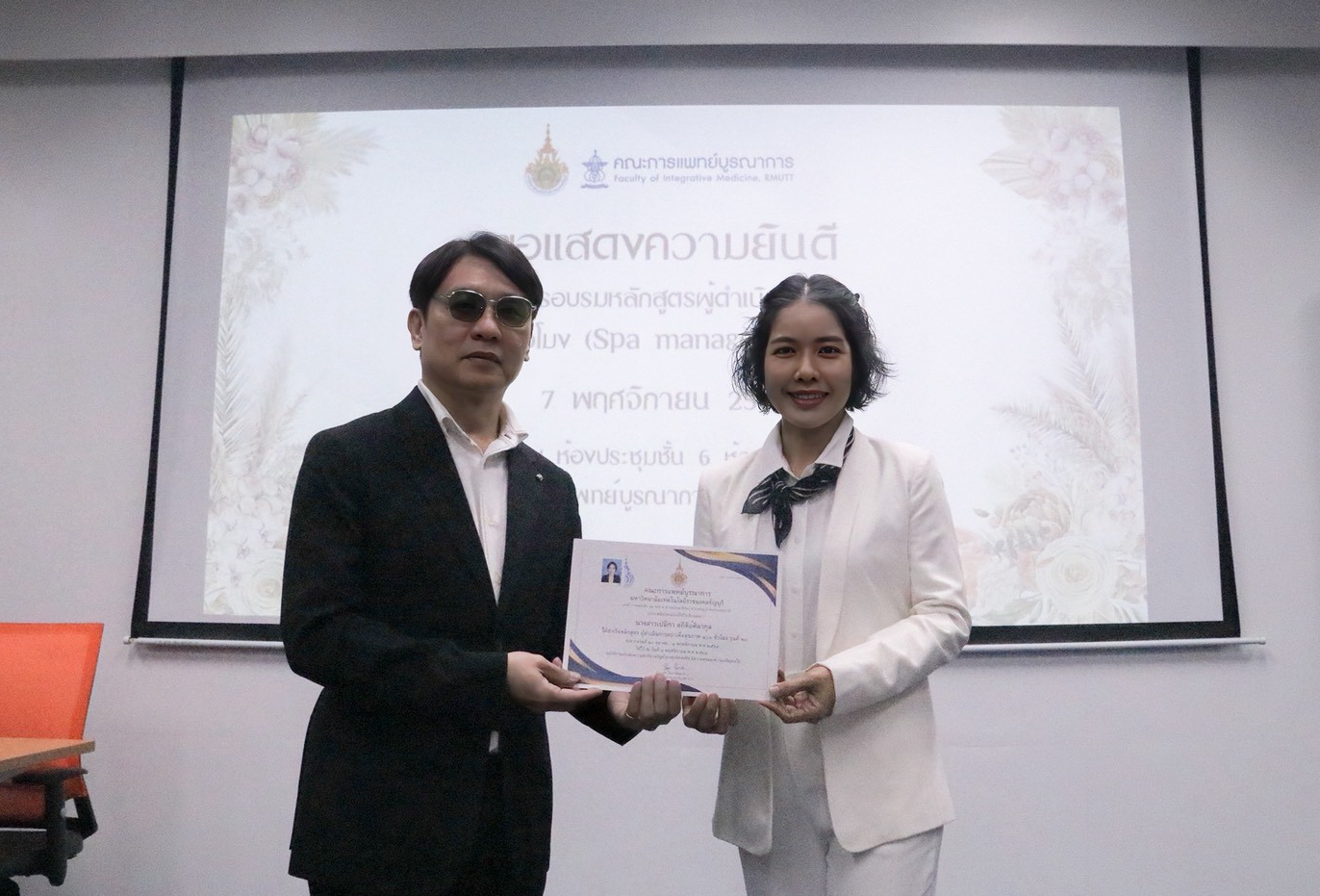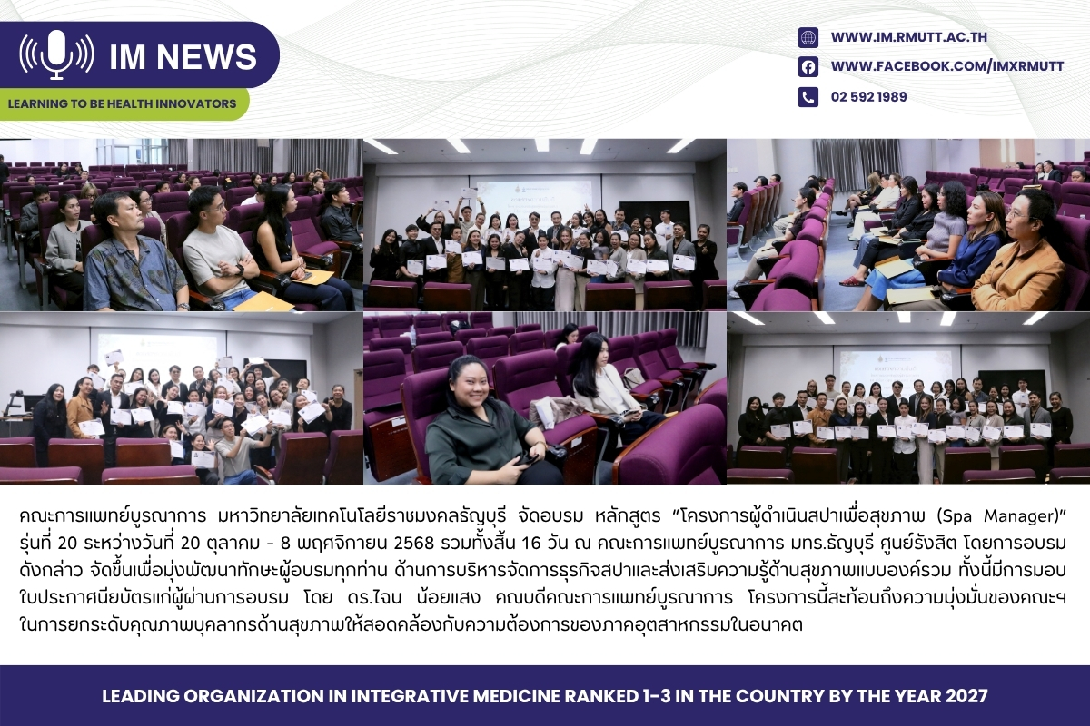 คณะการแพทย์บูรณาการ มหาวิทยาลัยเทคโนโลยีราชมงคลธัญบุรี จัดอบรม หลักสูตร “โครงการผู้ดำเนินสปาเพื่อสุขภาพ (Spa Manager)” รุ่นที่ 20 ระหว่างวันที่ 20 ตุลาคม – 8 พฤศจิกายน 2568 รวมทั้งสิ้น 16 วัน ณ คณะการแพทย์บูรณาการ มทร.ธัญบุรี ศูนย์รังสิต โดยการอบรมดังกล่าว จัดขึ้นเพื่อมุ่งพัฒนาทักษะผู้อบรมทุกท่าน ด้านการบริหารจัดการธุรกิจสปาและส่งเสริมความรู้ด้านสุขภาพแบบองค์รวม ทั้งนี้มีการมอบใบประกาศนียบัตรแก่ผู้ผ่านการอบรม โดย ดร.ไฉน น้อยแสง คณบดีคณะการแพทย์บูรณาการ โครงการนี้สะท้อนถึงความมุ่งมั่นของคณะฯ ในการยกระดับคุณภาพบุคลากรด้านสุขภาพให้สอดคล้องกับความต้องการของภาคอุตสาหกรรมในอนาคต