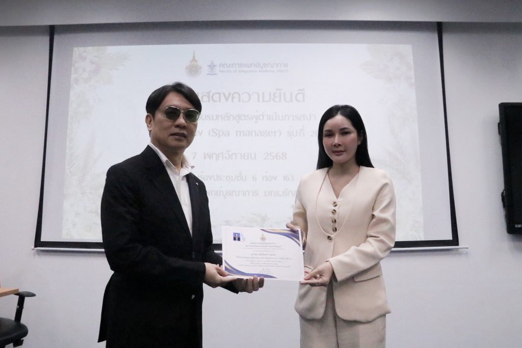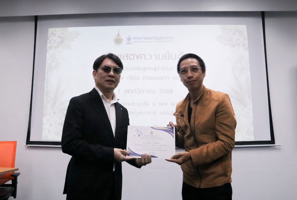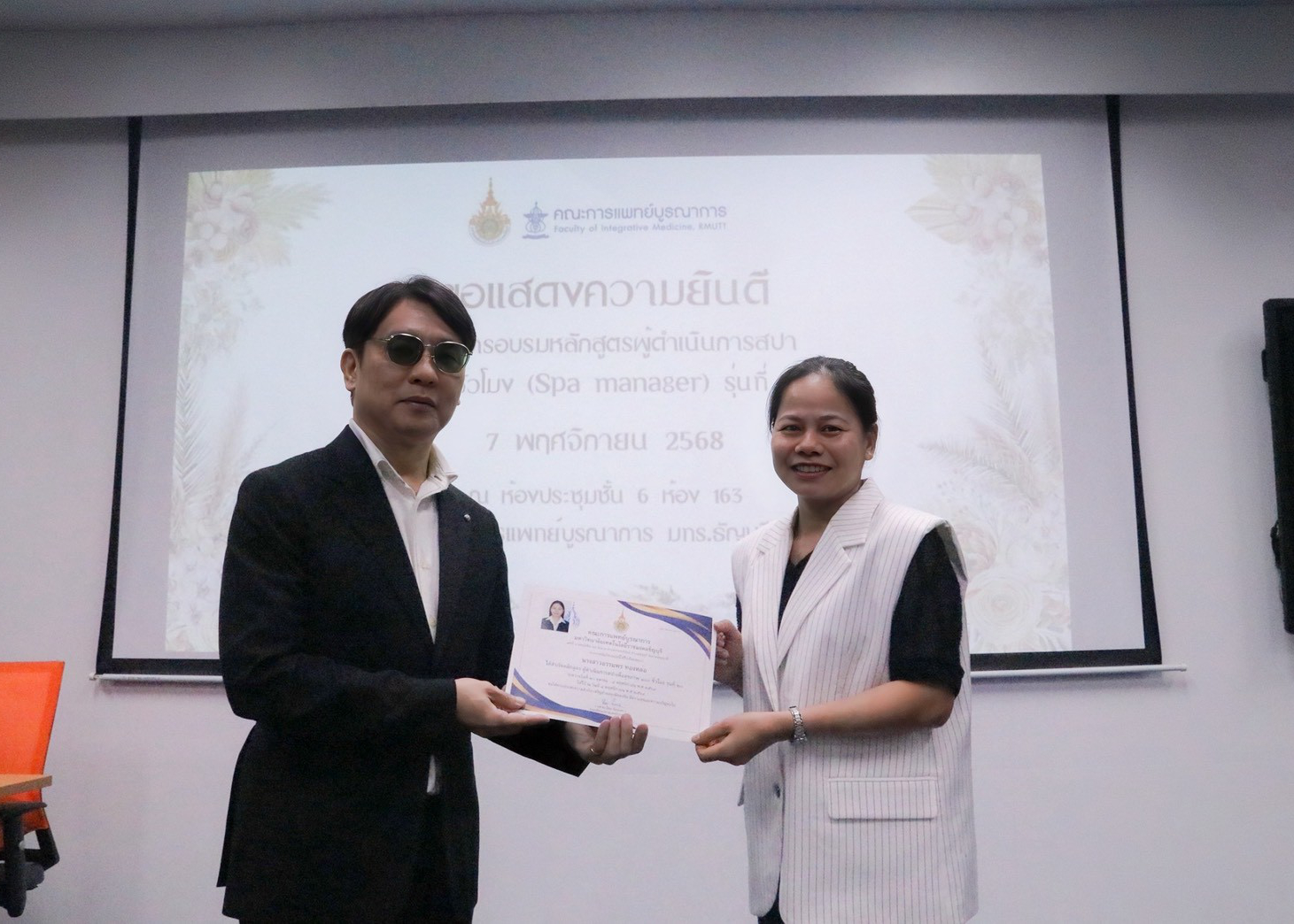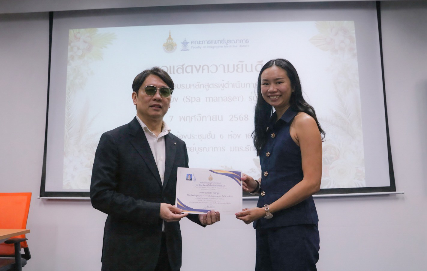 คณะการแพทย์บูรณาการ มหาวิทยาลัยเทคโนโลยีราชมงคลธัญบุรี จัดอบรม หลักสูตร “โครงการผู้ดำเนินสปาเพื่อสุขภาพ (Spa Manager)” รุ่นที่ 20 ระหว่างวันที่ 20 ตุลาคม – 8 พฤศจิกายน 2568 รวมทั้งสิ้น 16 วัน ณ คณะการแพทย์บูรณาการ มทร.ธัญบุรี ศูนย์รังสิต โดยการอบรมดังกล่าว จัดขึ้นเพื่อมุ่งพัฒนาทักษะผู้อบรมทุกท่าน ด้านการบริหารจัดการธุรกิจสปาและส่งเสริมความรู้ด้านสุขภาพแบบองค์รวม ทั้งนี้มีการมอบใบประกาศนียบัตรแก่ผู้ผ่านการอบรม โดย ดร.ไฉน น้อยแสง คณบดีคณะการแพทย์บูรณาการ โครงการนี้สะท้อนถึงความมุ่งมั่นของคณะฯ ในการยกระดับคุณภาพบุคลากรด้านสุขภาพให้สอดคล้องกับความต้องการของภาคอุตสาหกรรมในอนาคต