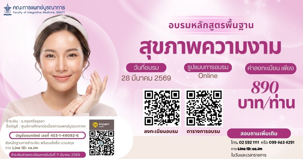 24/02/2026คณะการแพทย์บูรณาการ มหาวิทยาลัยเทคโนโลยีราชมงคลธัญบุรี ขอเชิญผู้สนใจเข้าร่วม โครงการอบรมหลักสูตรพื้นฐานสุขภาพความงาม เพื่อเสริมสร้างความรู้และทักษะพื้นฐานด้านการดูแลสุขภาพและความงามอย่างถูกต้อง พร้อมพัฒนาศักยภาพสำหรับผู้ที่สนใจนำความรู้ไปต่อยอดในการประกอบอาชีพด้านสุขภาพและความงาม
